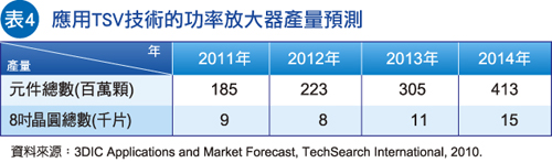 虽然仅有少数的资料探讨到3D堆叠在功率放大器上,但从2009年起,使用TSV技术来制造功率放大器的应用已有其市场,主要还是在8寸的晶圆尺寸上,由于应用面比较广,从2010年至2014年,产能将会大幅提升,表4即为使用TSV于功率放大器的应用预测。