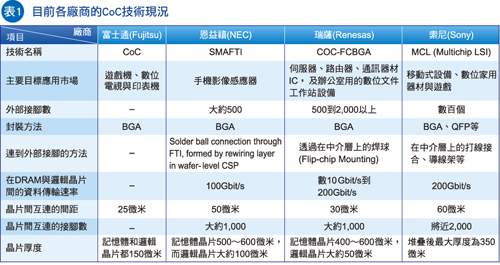 当然,应用CoC技术时,厂商最注意也是其最特别的地方,在于其可供应高速资料传输的特性,因为记忆体晶片使用微凸块与逻辑IC直接互连,且应用独立的记忆体晶片,也毋须再内嵌DRAM,且不会有效能下降风险(表1)。