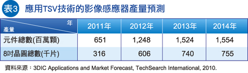 表3是针对使用背面进行TSV制程的影像感应器所做的产量预估。值得一提的是,影像感应器已进入3D堆叠应用,并且预测将于2013年,产量可达15亿颗。由于缩小尺寸是消费者的主要偏好,这个预测实现的可能性非常地高。
