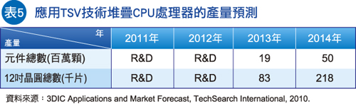 从表5可以看出应用于处理器上的TSV直至2013年后才会有产量出来,在这之前仅止于研发阶段,而且目标大多锁定12寸晶圆尺寸。