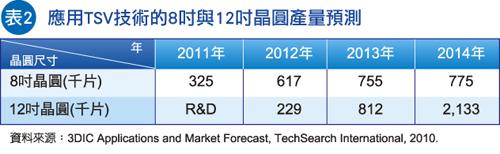 首先,表2整理8寸与12寸晶圆在未来使用TSV堆叠至少两颗晶片的应用产量,这个预测值包含各式应用,其中可以看出在2011年前,12寸晶圆的应用都仅止于研发阶段,但在2013年开始便快速发展。在那之前,各式的研发,都将于无晶圆(Fabless)、整合元件制造商(IDM)、封装厂,甚至于晶圆代工(Foundry)与封测代工厂(OSAT)进行。